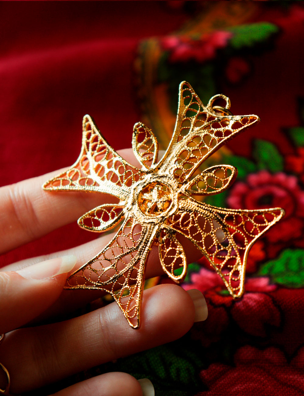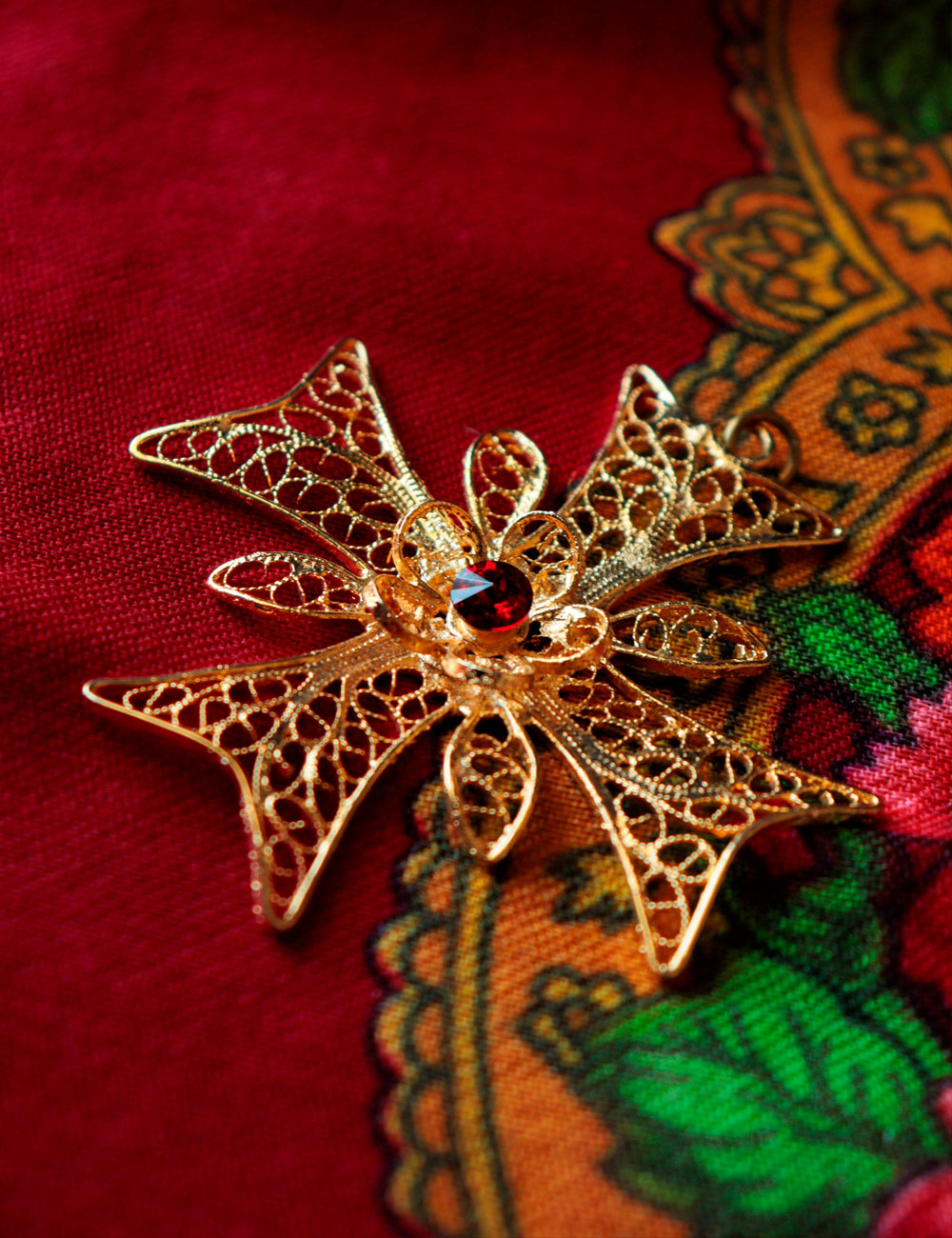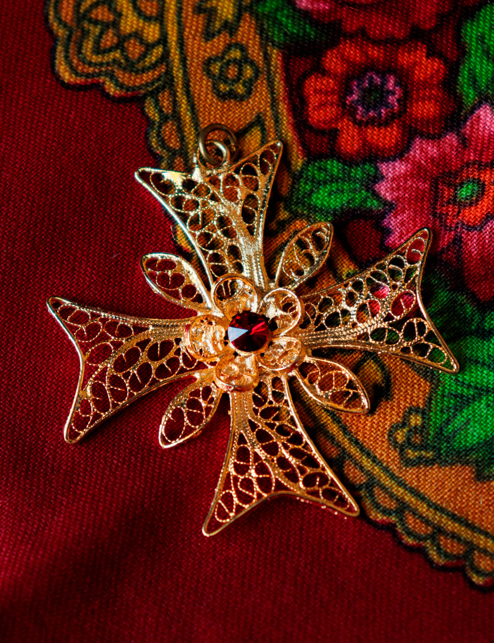 Pingente de fantasia, com formato de cruz de malta grande com pedra de vidro vermelha. Peça nova, pouquíssimo usada, em condição excelente. Mede cerca de 6 x 6 cm. Perfeita para completar um traje folclórico!